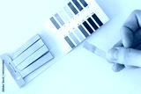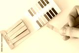 Water pH measurement test. Yellow strip in a woman's hand