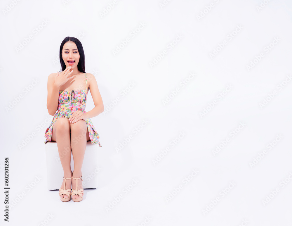 Portrait excited beautiful woman sit on chair with surprised face isolated on white background and copy space Surprise happy asian young lady open mouth with excited Beauty young female portrait