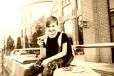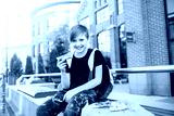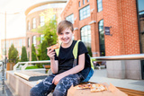 the boy holds a slice of pizza in his hand, is going to eat. the child ordered pizza, sits on a bench with pizza in a box on a sunny day in the backyard of the school