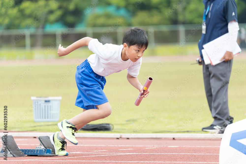 陸上大会でリレーを走る小学生の男の子