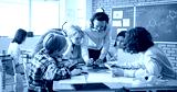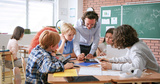 Happy primary school children sitting at round table and stacking their hands together with male teacher. Modern approach at educational system.