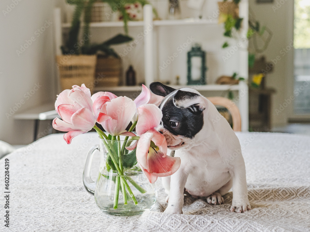 Cute puppy, bright bouquet of tulips standing in a vase on a table by the window in the living room. Studio shot. Clear, sunny day. Close-up, indoors. Day light. Concept of care and training pets