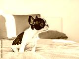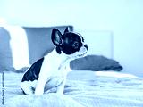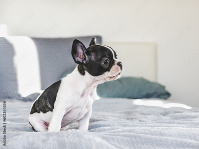 Cute puppy sitting on the bed in the living room. Clear, sunny day. Closeup, indoors. Studio photo. Day light. Concept of care, education, obedience training and raising pets