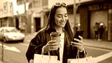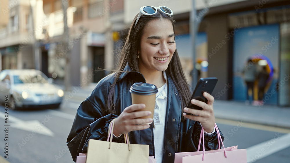 Young beautiful hispanic woman using smartphone holding shopping bags and coffee at street