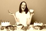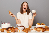 Joyful woman wearing white T-shirt eating delicious desserts and drinking coffee or tea isolated over gray background, laughing, looking at camera, enjoying festive dinner.