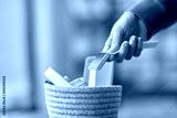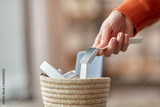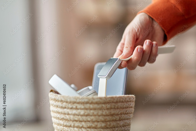 digital detox and technology concept - close up of hand holding smart watch and different gadgets in wicker basket on table at home