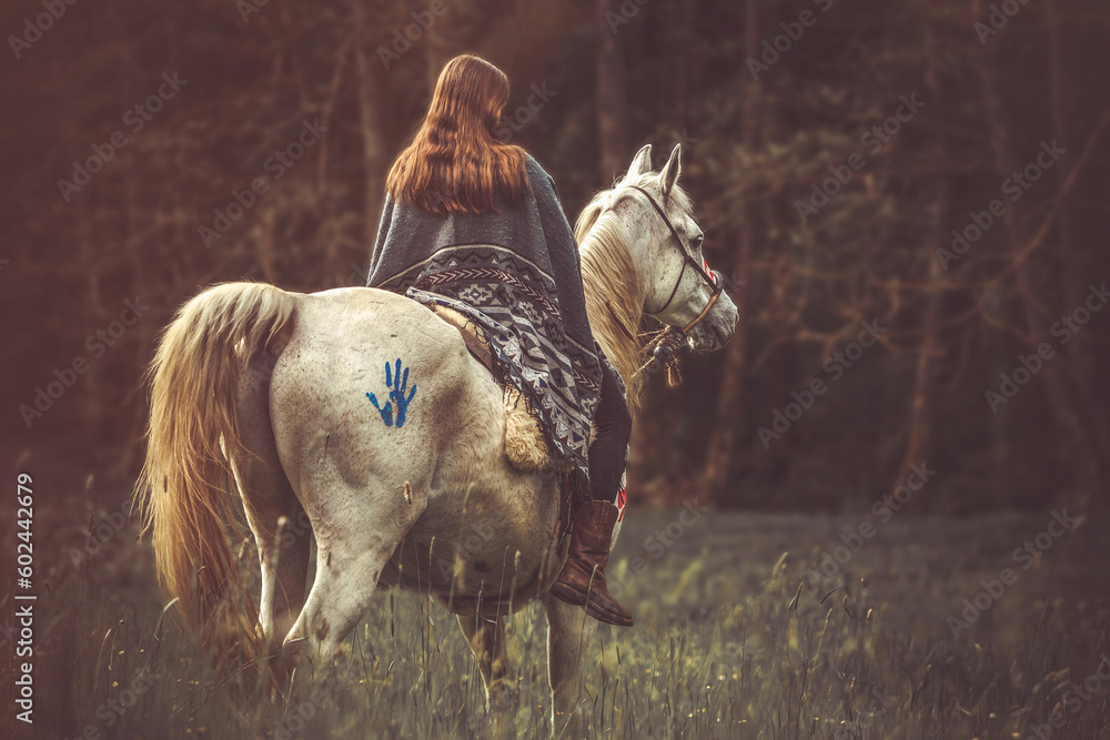 Portrait of a woman on her american native decorated white arabian horse in spring outdoors