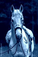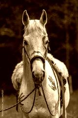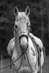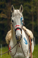 Close-up of indigenous war paint decoration marks on a white arabian horse