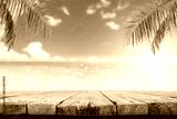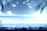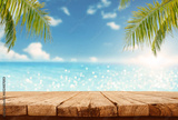 Empty wooden table are placed outdoors on spring sunny sky background with blue sparkling sea water and bokeh blurry. Counter display concept