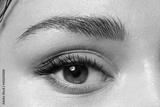 Close up of beautiful brown female eye with perfect shaped fashion eyebrow, smoky eyeshadow, eyelashes colored by mascara. Good healthy vision, trendy makeup, brow beauty salon advertising.