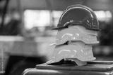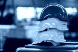 Yellow and blue helmet or hard hat for head safety in industry factory. equipment safe of worker construction. Futuristic industry production manufacturing.