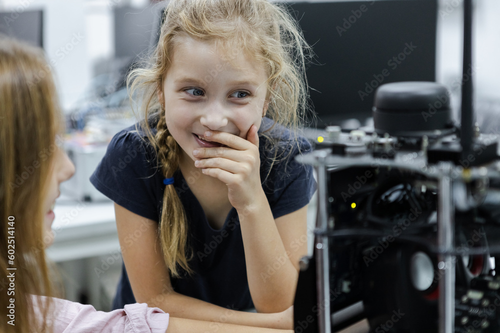 Happy girl education electronic robotic on table at class room. learning innovation robot electronic for future AI. System skill training. STEM education concept.