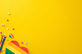 A top view flat lay of parade symbolic accessories, including wristlet, badge, hearts, rainbow card, on yellow backdrop with empty space for text or ad, celebrating the theme of Pride and inclusivity