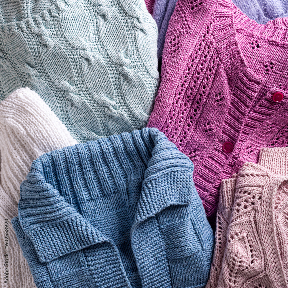 Overhead view of folded handmade assorted sweater clothing. Homemade colorful knitted clothes background. Modern Sweater Jersey Apparel