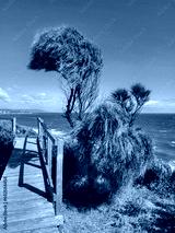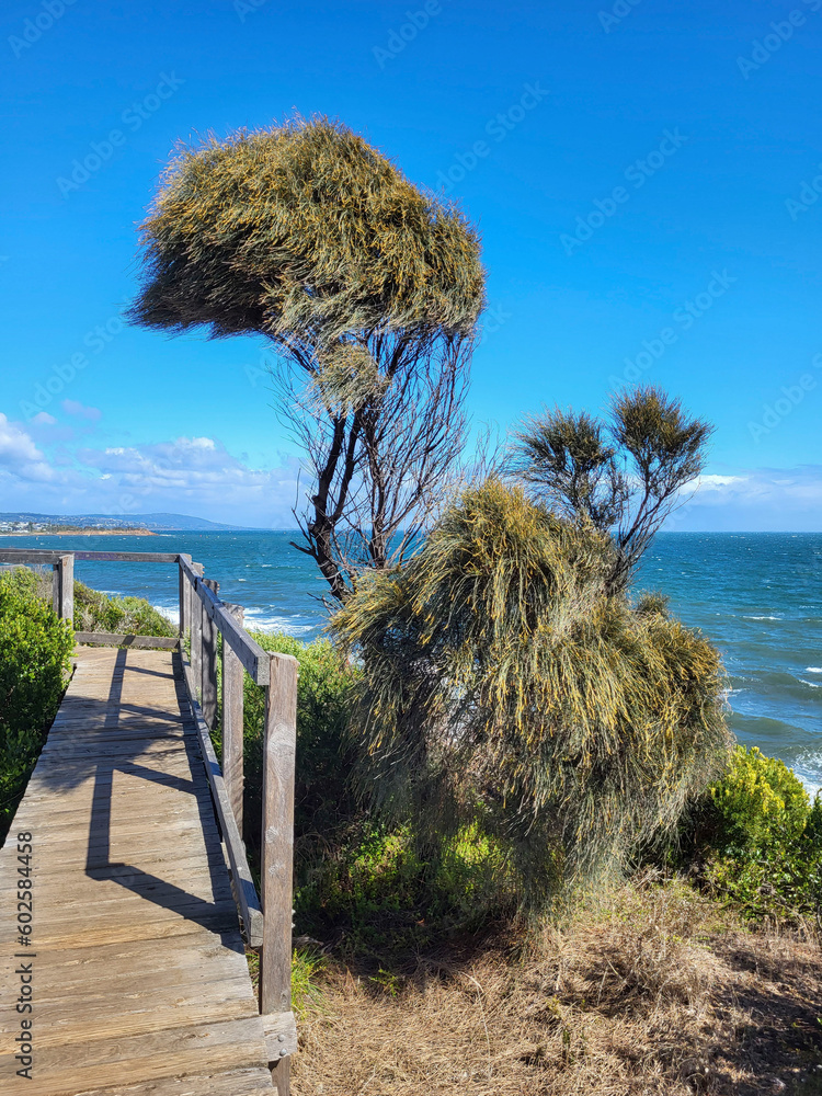View from the boardwalk at Mornington overlooking Port Phillip Bay with rough seas and blue skies.