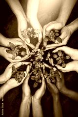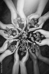 Hands together, dirt and plants growth with sustainability and community work. People, top green leaf and environment project for gardening, farming and sustainable eco soil for agriculture leaves