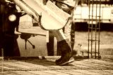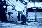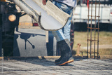 Workers Legs were pouring concrete in construction site. Poor Labor wear boot and mix Cement on floor.
