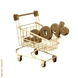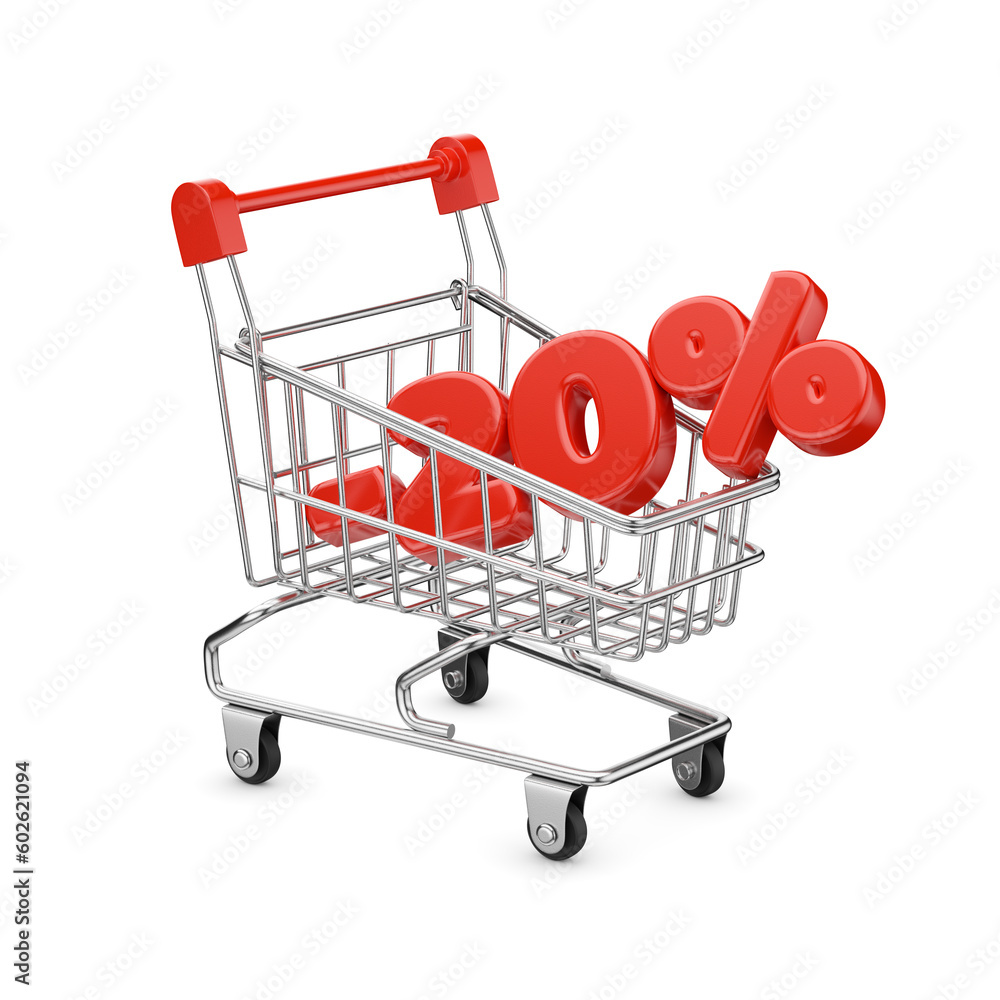 Tiny red colored shopping cart and twenty percent discount text isolated. 3D rendering. Transparent PNG image.
