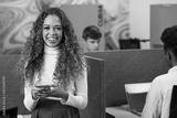 Young multi-ethnic woman texts with cellphone, standing in busy open plan office