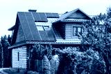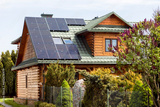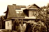 Solar panels on Roof of Old Wooden House in Countryside. Mansard Rooftop with Skylight Windows and Solar Panel System.