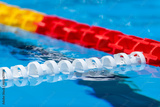 The view of an empty public swimming pool indoors. Lanes of a competition swimming pool. Horizontal sport theme poster, greeting cards, headers, website and app