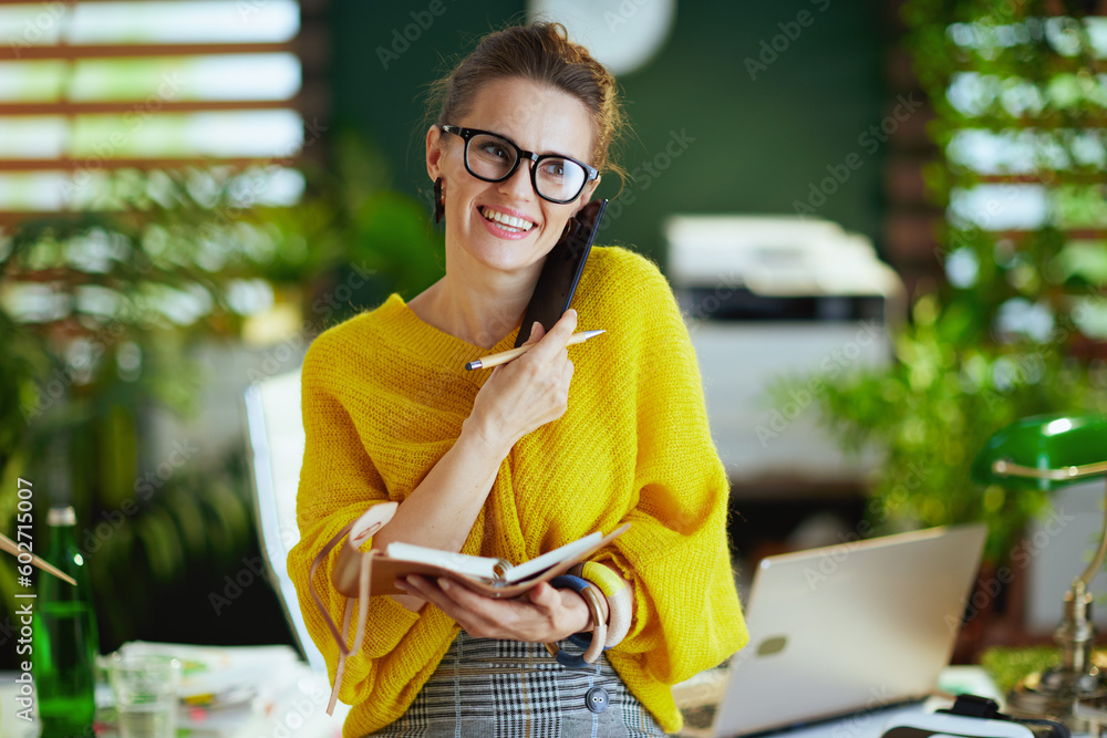 happy business owner woman in green office talking on phone