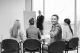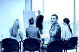 businessman with team showing thumbs up in office
