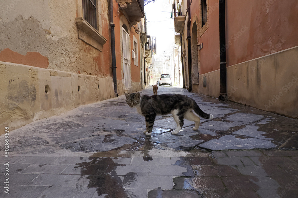 cat in ortigia syracuse old buildings street view Sicily on sunny day