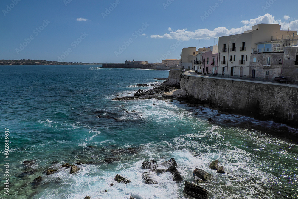 sea on ortigia syracuse old buildings street view Sicily on sunny day