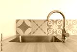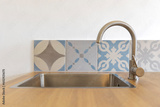 In the foreground there is a sink made of stainless steel with a top made of wood. Behind it are blue tiles and a white wall