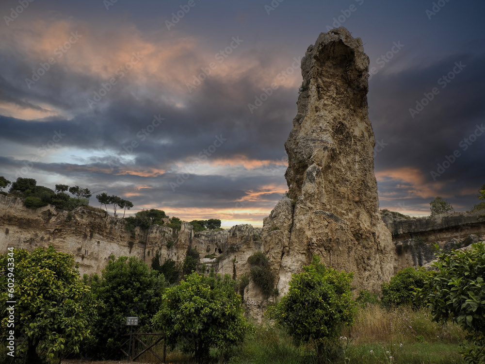 Sunset view Ear of dionysus and Cave of the Nymphaeum (Grotta del Ninfeo) artificial cave on Greek Roman theater in Syracuse