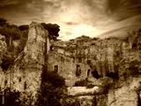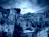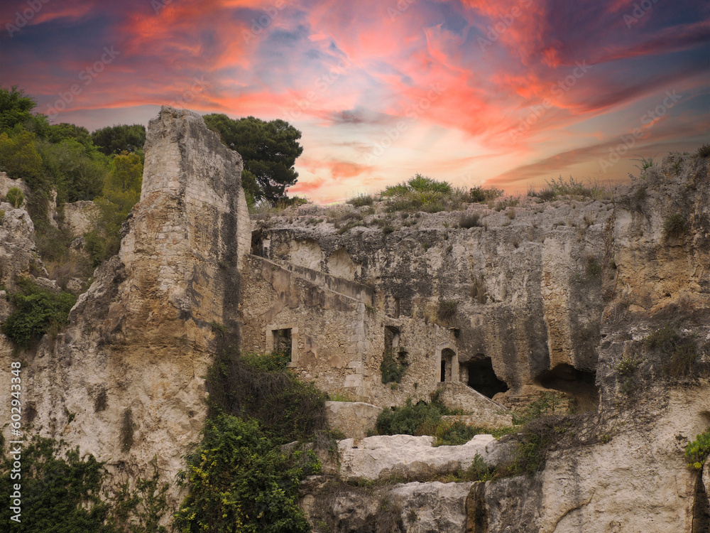 Sunset view Ear of dionysus and Cave of the Nymphaeum (Grotta del Ninfeo) artificial cave on Greek Roman theater in Syracuse