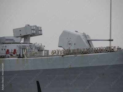 Detail of modern warship with Rolling Airframe Missile and cannon battlecruiser