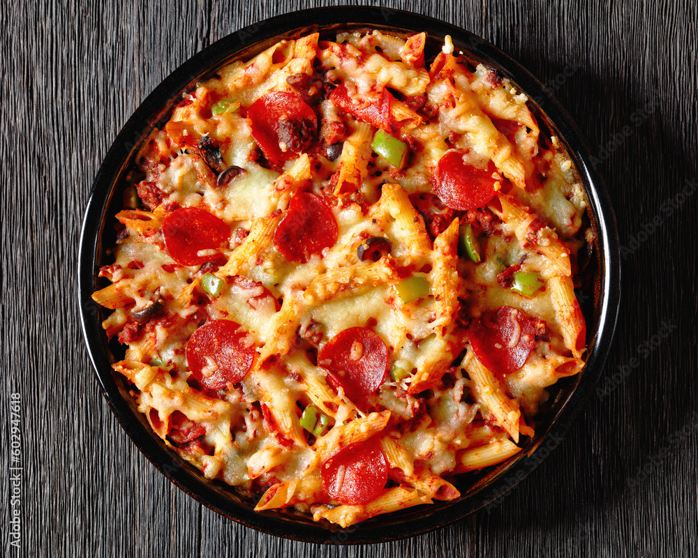 Pizza Casserole of pasta, beef, pepperoni, cheese