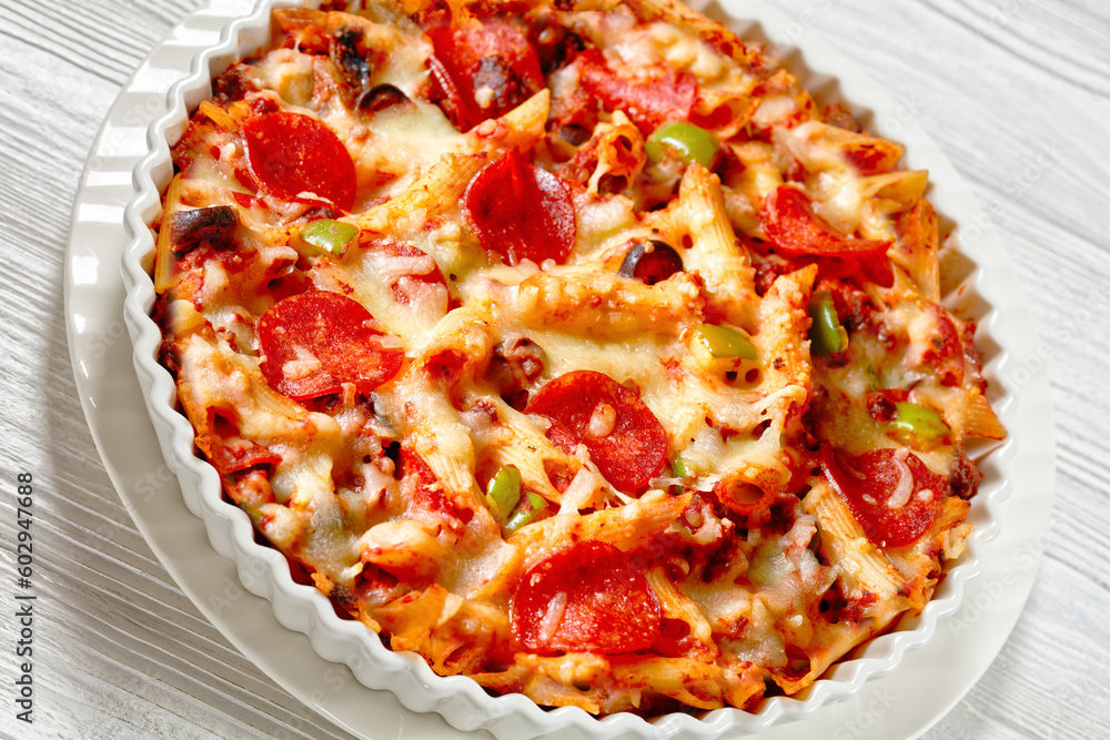 Pizza Casserole of pasta, beef, pepperoni, cheese
