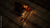 Aerial shot at night harvester gathering crops from agricultural fields. Global food crisis and grain supply chains