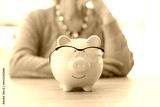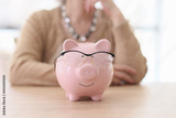 Pink piggy bank with glasses stands on wooden table at lady