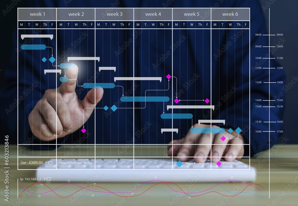 Project managers work and update tasks by planning milestone progress and scheduling diagrams of