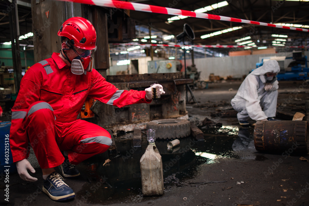 Worker or scientist industry wearing protective safety uniform, white glove and gas mask under cleaning up and lapping spilled oil in factory area to check in laboratory is industry safety concept.