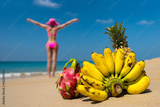 Tropical fruits and woman sunbathing on the beach