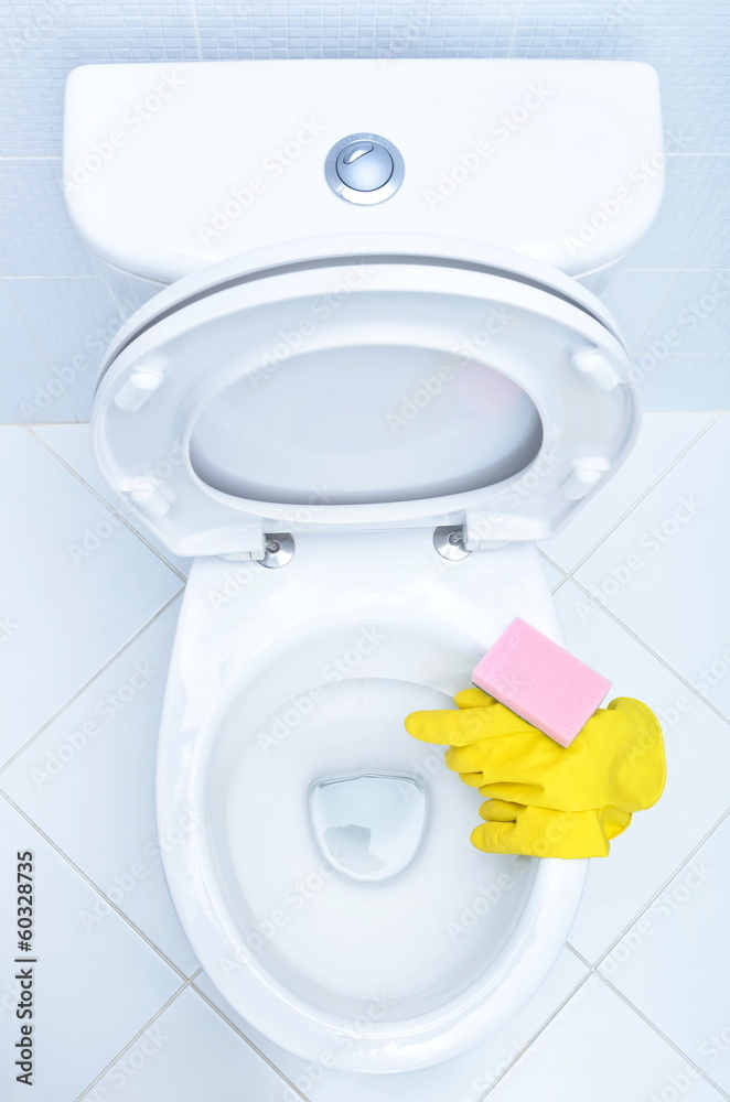 Hands on yellow gloves cleaning a WC