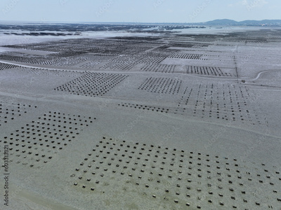 Aerial view of Oyster farm. Sustainable farming. Oyster farming is an aquaculture practice. Oyster farming at Ang Sila town, Chonburi, Thailand. Landscape oyster beds at low tide on summer sunny day.