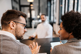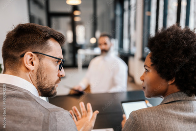 The multicultural managers are discussing about employing a junior executive while sitting at the office in corporate firm.