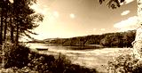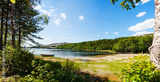 Panoramic view of a lake with boat from a forest in Northern Nor