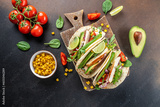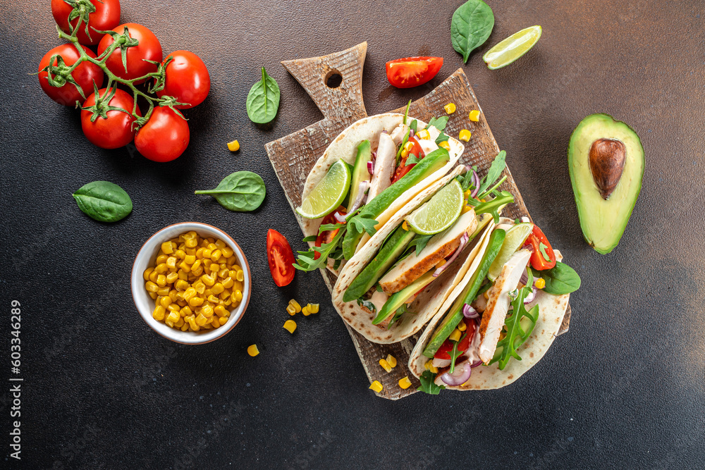 Mexican grilled chicken, avocado, fresh tomatoes, limes Tacos with Vegetables and Corn, Set of burritos or tacos. place for text, top view