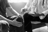 Man coming to the doctor with knee pain Health care and health insurance concept: orthopedic specialist doctors and nurses interacting with patients.