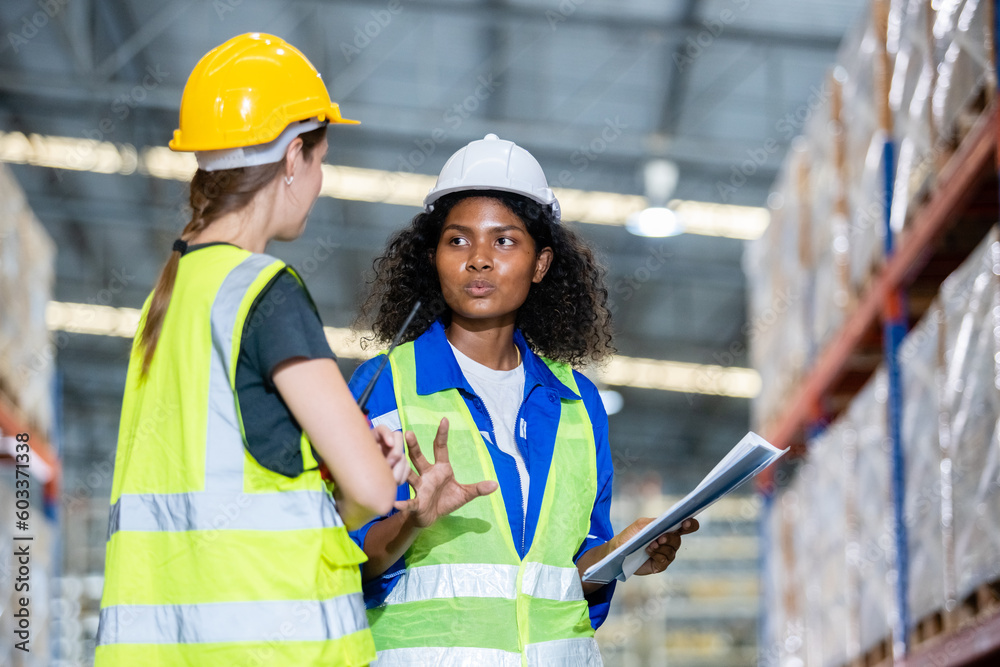 Warehouse worker team checking inspect goods on shelves. women worker check stock inspecting product in factory. Woman teamwork talking and check stock product in storehouse.