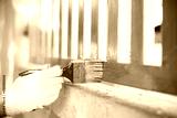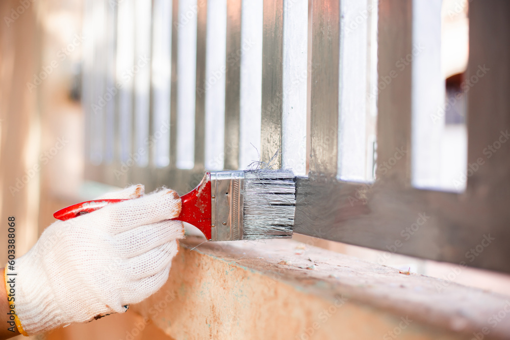 Human hand painting a house fence, doing home improvement by refreshing the paint of the steel fence. Close-up hand wearing glove and holding brush. Fresh wet silver paint.