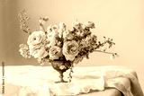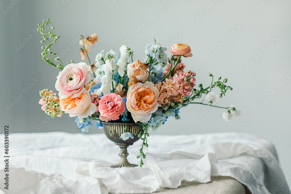 Still life of Flowers bouquet in vintage vase on white linen French tablecloth