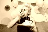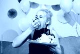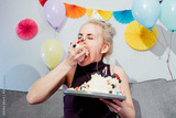 Woman in festive dress and party cap eating birthday cake with her hands, her face stained cream. A woman stuffing her face with cake. Crazy celebrating birthday party at home. Selective focus.
